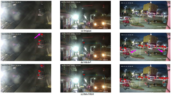The comparison results of the YOLOv7 model and the SMA-YOLO model proposed in this paper for the detection of vehicles at night are shown in Figure 6. Comparing the three images in the first column of Figure 6, it can be seen that the YOLOv7 model missed the detection of the truck indicated by the pink arrow due to insufficient light and strong interference at night, while the proposed SMA-YOLO model successfully detected the location of the truck and was able to identify its category. Comparing the three images in the second column of Figure 6, it can be seen that the lights of the mixer truck were highly intrusive and the far rear lighting of the truck was very harsh. Although the YOLOv7 model was able to detect the mixer truck, the location and size of the detection frame were incorrect, while the detection frame generated by the proposed SMA-YOLO model more closely matched the outline of the mixer truck. Comparing the three images in the third column of Figure 6, it can be seen that the YOLOv7 model incorrectly classified the tricycle as a car (as indicated by pink arrows), while the SMA-YOLO model was able to classify it correctly. These experiments show that the proposed SMA-YOLO model exhibited more accurate detection of ambiguous vehicles in complex nighttime scenes and generated detection frames that fit the contours of the detected vehicles more closely.