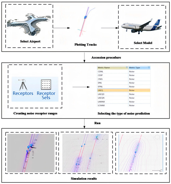Noise contours serve as essential tools for predicting and mitigating noise annoyance. They provide critical information for land-use planning guidelines and regulations, as well as other strategies aimed at reducing noise annoyance [34]. The Aviation Environmental Design Tool 3d(AEDT V3d) is a specialized software system designed to simulate aircraft operating procedures and calculate the noise impacts generated during the takeoff and landing processes of single or multiple flights. The aircraft performance data utilized by AEDT primarily originates from the International Civil Aviation Organization (ICAO) Aircraft Noise and Performance (ANP) database and the Base of Aircraft Data (BADA). AEDT is capable of accurately assessing the propagation characteristics of noise during flight operations and is well-suited for average noise assessments in complex scenarios, such as annual aviation operations. The quality of the input data has a significant impact on the prediction accuracy. The specific operational procedures are illustrated in Figure 1.