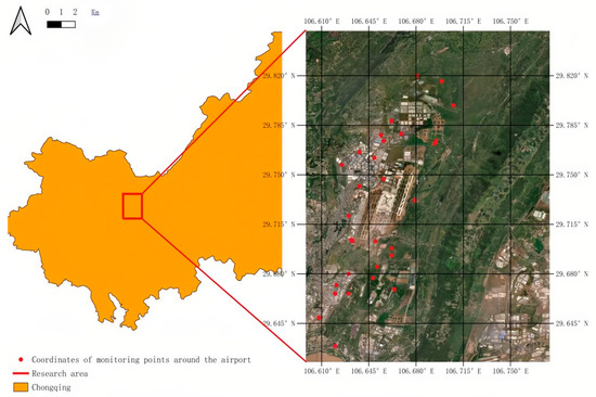 This study collected data from 30 monitoring stations situated around Chongqing Jiangbei International Airport, with their geographic locations depicted in Figure 4. These stations are equipped with high-precision sensors that facilitate real-time collection of multidimensional environmental data, covering key meteorological parameters such as temperature, humidity, wind speed, and precipitation. Meteorological data are sourced from the meteorological stations associated with each monitoring site, ensuring the timeliness and accuracy of the data. The wide distribution of the monitoring stations enables comprehensive capture of the meteorological conditions in the airport’s surrounding area, providing essential environmental variables for subsequent noise prediction. Additionally, this study integrates aircraft flight data obtained via the ADS-B (Automatic Dependent Surveillance-Broadcast) system, including information on flight altitude, longitude, and latitude. These data, characterized by high temporal resolution and spatial accuracy, offer critical dynamic flight parameters for the noise prediction model. To address the heterogeneity of these data, this study employs multi-source data fusion techniques to process and integrate data from different sources, resolving discrepancies in format, precision, and spatiotemporal scales.