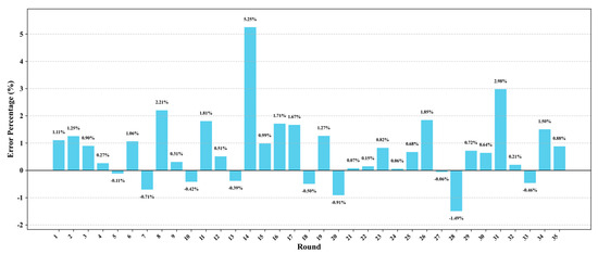 Analyzing the dynamic trend of the error distribution, the model initially exhibits some fluctuation but subsequently converges progressively, thereby demonstrating robust predictive consistency. Among the total 35 rounds, 62.9% (22/35) manifest positive errors. The error distribution reveals a pattern of alternating overestimation and underestimation, with the amplitude of these fluctuations gradually diminishing to the range of −1.49% to +1.50%. This alternating pattern, in conjunction with the trend of gradual convergence, further underscores the model’s robustness and dynamic adaptability.