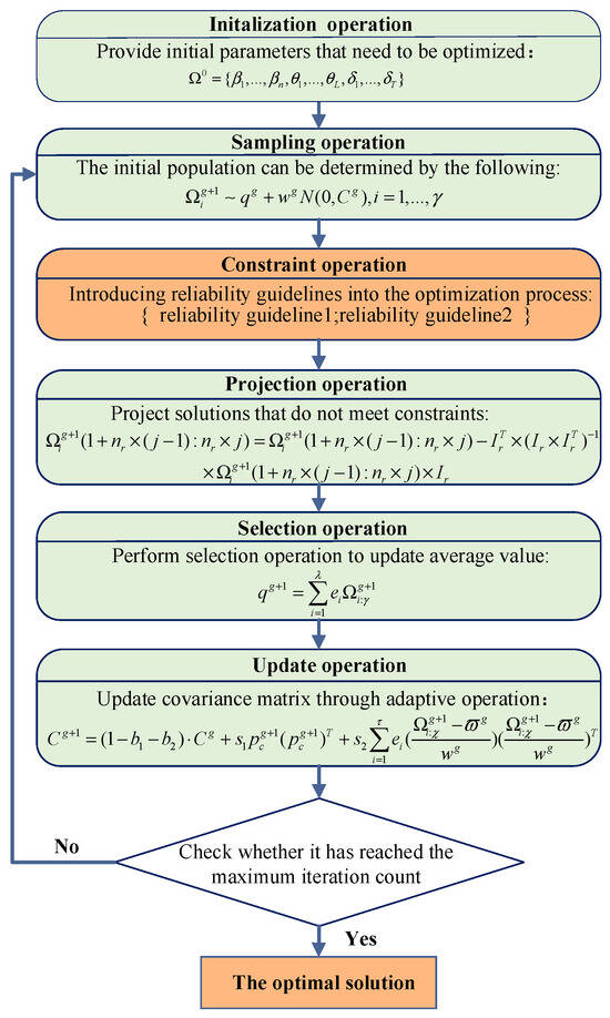To further enhance the accuracy of fault diagnosis, the projection covariance matrix adaptation evolution strategy (P-CMA-ES) is utilized to optimize the attribute weights, rule weights, and belief degrees of the DI-BRB-R model [46]. This method features an adaptive search strategy that dynamically responds to the characteristics of different optimization problems. Nevertheless, the original P-CMA-ES algorithm relies on global stochastic search, iteratively approaching the optimal solution through scattered sampling. While this process exhibits strong global search capabilities, it may lead to significant deviations of parameters from the initial values generated by the DI-BRB-R model, thereby compromising the model’s reliability. To address this issue, a group of reliability guidelines is introduced in Section 3.3 to improve the P-CMA-ES algorithm. In the improved P-CMA-ES optimization process, reliability constraints are applied after the initial population generation of each generation. The process first limits all parameters within the preset reliability constraint range to avoid values that exceed the constraint boundary. Then, the projection operation of equality constraints is performed on the relevant parameters belonging to the same group to meet the expected characteristics, thereby ensuring the rationality of the parameter distribution within the group. Thus, the improved P-CMA-ES can preserve optimization performance while effectively constraining parameter deviations, ensuring structural rationality during optimization and consistency with the initial parameters provided by the model.