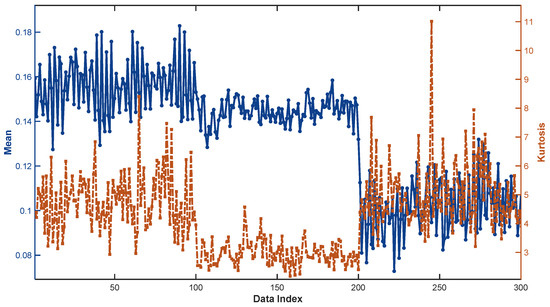 In this experiment, a data-driven initialization was performed for the reference values of the antecedent mean and kurtosis attributes using the DBI-FCM method. As specified in Formula (14), the search range for the number of clusters was set from 2 to 7. The FCM algorithm was then applied to obtain the cluster centers for each specified cluster count. To assess the quality of each clustering result, the corresponding DBI was calculated, which served as a criterion for assessing clustering performance and guiding the selection of the optimal quantity of clusters. The cluster centers and DBI obtained for the mean and kurtosis attributes under different clustering conditions are summarized in Table 2 and Table 3. According to Table 2 and Table 3, the best DBI for both the mean and kurtosis were achieved when the quantity of clusters was set to 2. Therefore, the additional reference values for the mean were determined to be 0.0993 and 0.1494, and those for Kurtosis were 3.2291 and 5.2068. The final reference values, attribute weights, and reliability constraint intervals defined for attribute weights based on the reliability guideline 2 in Section 3.3 are listed in Table 4, where their initial attribute weights all set to 1. Based on the Cartesian product of the reference values, a total of 16 rules are generated. As each rule corresponds to three fault states, the model requires 16 × 3 = 48 belief degrees in total.