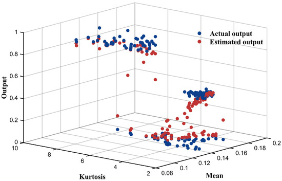 The belief degrees were initialized using the LS-GMF method described in Section 3.2. To verify the effectiveness and appropriateness of the selected standard deviations for the Gaussian membership function, a comprehensive sensitivity analysis was conducted to examine the influence of varying standard deviation values on model accuracy. The optimal standard deviations were determined to be 0.02 for the mean, 0.7 for kurtosis, and 0.4 for the fault states. These values were chosen through a quantitative assessment of their influence on membership degree variation and the model’s overall performance. This ensured that sample points closer to the distribution centroid received higher membership degrees, thus capturing the local features of the data more effectively. Subsequently, Formulas (20) and (21) were applied to compute the membership degrees of the input sample relative to each antecedent reference value and each fault state, respectively. Based on these membership degrees, Formula (22) was used to compute the corresponding integrated membership degrees. Each rule was then examined to determine whether Laplace smoothing correction was required. Finally, the initial belief distribution of the BRB was obtained by normalizing the integrated membership degrees from all inputs and recording them in the constructed posterior probability distribution matrix. Table 5 shows the initial belief rule base of the DI-BRB-R model, as well as the reliability constraints defined for the belief rule base and rule weights based on the reliability guidelines in Section 3.3, where all rule weights are initialized to 1.