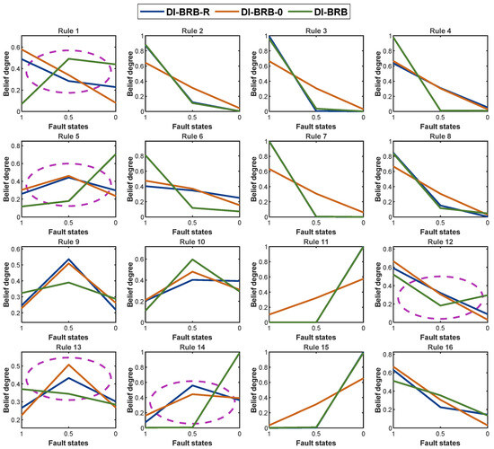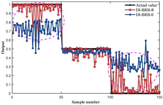 In Section 4.1, a diesel engine fault diagnosis model based on the DI-BRB-R is established. The MSE of DI-BRB-0 is 0.0662. DI-BRB-R achieved an MSE of 0.0120 in testing. Figure 5 presents a comparative analysis of the diagnostic results of DI-BRB-0, the DI-BRB-R model, and the actual fault states. The results demonstrate that the fault diagnosis model constructed by the DI-BRB-R model not only achieves high accuracy in identifying diesel engine faults but also effectively improves the modeling ability of the BRB by introducing data-driven methods. The part circled by the dashed circle clearly indicates that the DI-BRB-R model can better and accurately diagnose faults in diesel engines. Consequently, even when expert knowledge is limited, the proposed DI-BRB-R model remains effective in diagnosing the fault states of diesel engines.