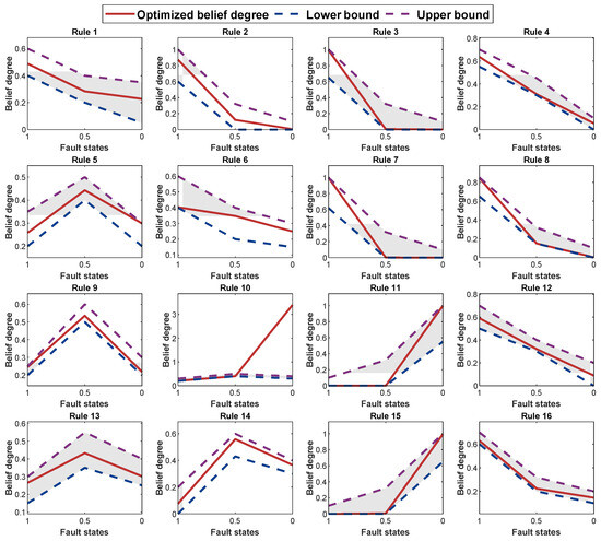 To ensure the reliability of the model during the optimization process, the domain experts set reasonable constraint ranges for belief degrees during the optimization process based on the initial belief distribution of the DI-BRB-R model, namely the upper and lower limits of belief degrees. This constraint mechanism ensures that parameter adjustments during the optimization process are consistent with the initial belief degree distribution, improving the reliability of the model’s diagnostic results. Specifically, the belief degree of each rule must lie within a valid interval. The belief degree constraint is formulated as follows: