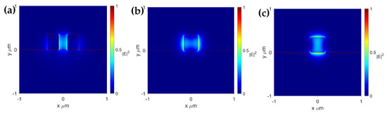 Cross -section of the E-field distribution of TE modes in (a) slot, (b) ridge (TE mode), and (c) ridge (TM mode) waveguides.