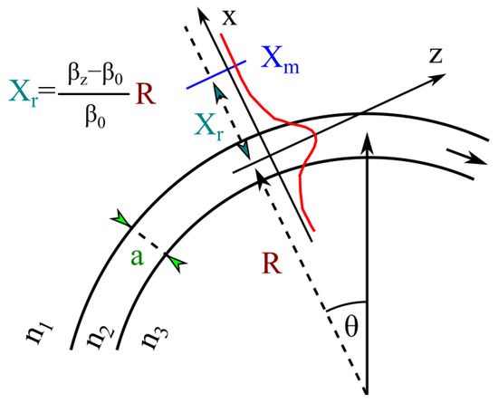 We evaluated the bending losses by taking an overlap integral between the straight waveguide mode and its curved counterpart, using the built-in mode overlap functionality in Lumerical MODE. Equation (4) shows the dependence of the radiation loss on the radius of the curvature of the waveguide. Figure 3 schematically shows the propagation of the radiated mode in a bend. It is worth noting that the solution of the wave equation changed with the radius of curvature of the bend, which is shown in Equation (4) for the symmetrical waveguide.