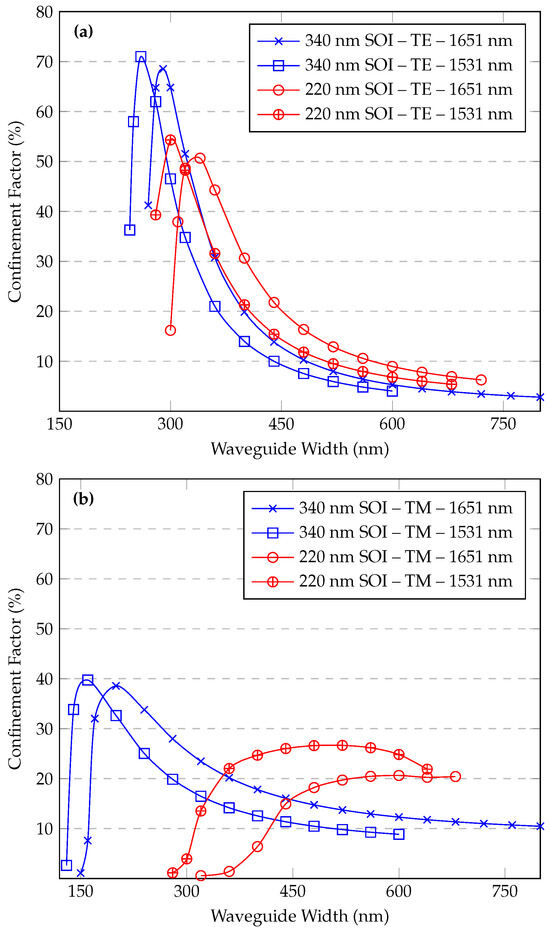 This work focuses on standard silicon-on-insulator (SOI) platforms with silicon heights of 220 nm and 340 nm, which are commonly employed in the silicon waveguide industry. The confinement factor is shown in Figure 4 for both TE and TM modes of a ridge waveguide at wavelengths of 1651 nm and 1531 nm, plotted against the waveguide width. These wavelengths were chosen as representative absorption lines for the greenhouse gases methane and ammonia, respectively.