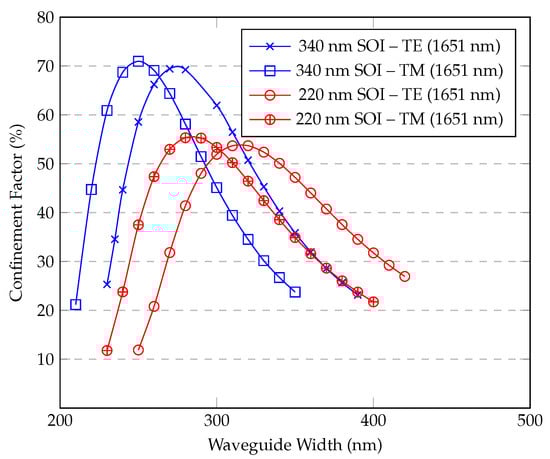 For the SOI waveguide with a height of 340 nm, the ridge structure supports only the TM mode for widths up to 260 nm. Its width is 270 nm, and it also supports the TE mode. The TE mode achieves its highest confinement factor () of 68.5% at a width of 290 nm. In contrast, for the 220 nm height, the TE mode shows similar results but with a lower maximum of 50.7%, which occurs at a slightly larger waveguide width of 340 nm. However, for the TM mode, the 220 nm platform presents a different curve with a significantly lower . For widths of 720 nm and above, the components and of the TM mode correspond to a second-order mode, and a third-order mode begins to be supported at a width of 680 nm.