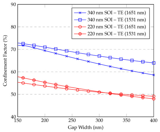 We then analyzed the confinement factor in slot waveguides. Slot waveguide is an optical waveguide that guides light through a subwavelength-scale, low-refractive-index region (the “slot”), which is the gap between two high-refractive-index strips, enabling strong confinement of light in a small area (the gap). Figure 6 shows the variation in the confinement factor with gap width for the fixed parameters of the waveguide, for the highest confinement factor strip width (as per in Figure 5). These results show that the confinement factor decreases with a gap and shows a nearly linear dependency on the gap width. This can be explained by the fact that when the gap between the strips is smaller, the interaction between the two modes within the strips increases. This increased interaction leads to a higher fraction of the intensity within the gap.