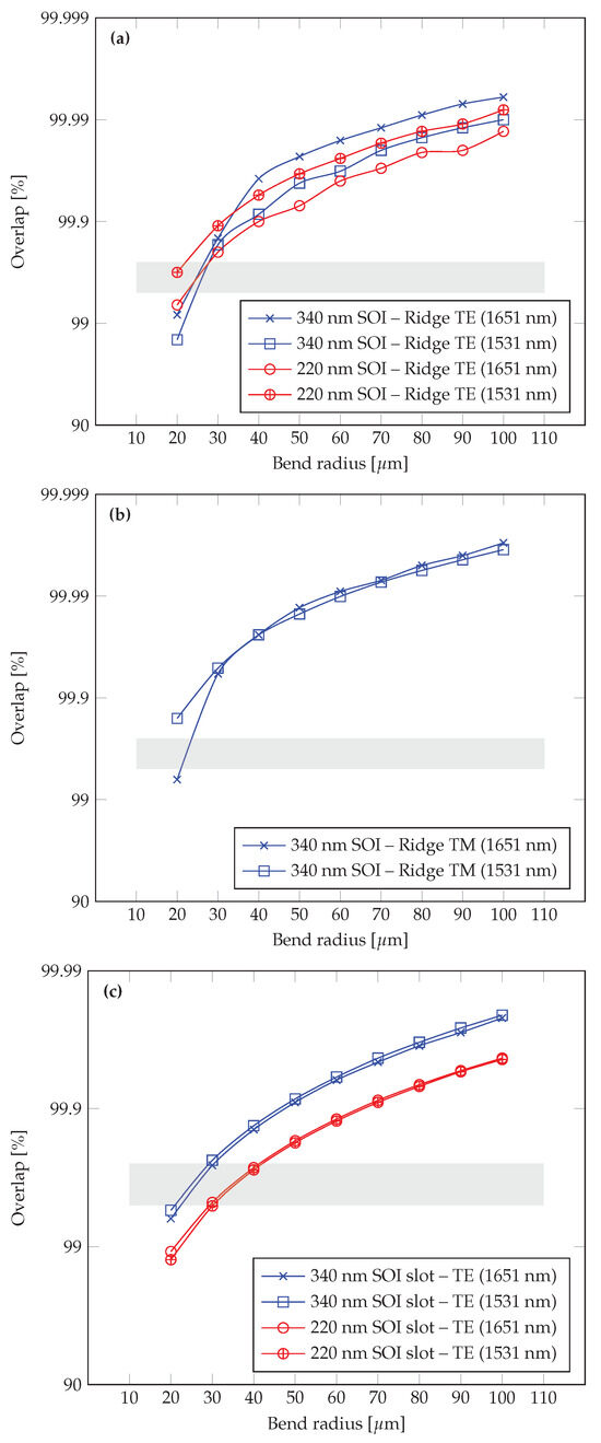 Mode overlap for curved waveguides versus bending radius for different waveguide architectures: (a) Ridge TE, (b) Ridge TM, (c) Slot, and SOI heights. Shaded region indicates the loss range (0.25–0.5%) discussed in the main text as a practical reference for evaluating bending-induced attenuation.