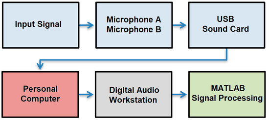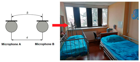 We selected a pair of Superlux ECM999 microphones (Superlux Enterprise Development Ltd., Shanghai, China) for recording. These are condenser microphones designed for use in testing, measuring, and recording applications. The manufacturer claims that the microphone has several room analysis systems. The microphone provides accurate sound response and covers the whole audible spectrum (20 Hz–20 kHz). This type of microphone is also used for recording vocal–instrumental events or capturing the general atmosphere of rooms. It requires phantom power within the range of 9 V to 52 V for power supply and has a maximum volume level of 128 dB. The detailed technical specifications of the microphone are as follows: microphone type: condenser, electret, Ø 0.24 “1/4” pre-polarized condenser capsule; directional characteristic: omnidirectional; frequency response: 20 Hz–20,000 Hz; sensitivity: −37 dBV/Pa (14 mV); output/min. load impedance: 200 Ω/1 kΩ; SNR: 70 dB; maximum sound pressure level: 132 dB; dynamic range: 10 dB; power supply: phantom power, 12–52 V DC, 2 mA; polar pattern: omnidirectional; and equivalent output noise: 24 dB. Regarding the various adjustment options, we used microphone stands with Lewitt TMS131 booms (Lewitt GmbH, Vienna, Austria). For accurate simultaneous recording using two microphones, we used a universal USB audio converter, the Focusrite Scarlett 2i2 3rd generation (Focusrite Audio Engineering Ltd., Hertfordshire, UK). This external sound card has two combined inputs, two-line outputs, and a headphone output (6.3 mm jack) with separate volume control. It features high-quality A/D and D/A converters with 24-bit/192 kHz resolution, as well as microphone preamplifiers. The sound card offers low distortion, low latency, and a high SNR of more than 100 dB.