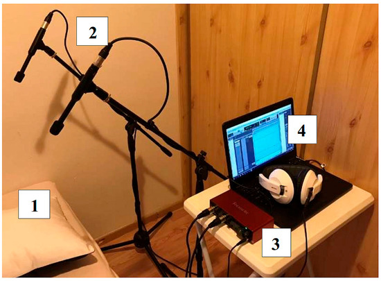 Measurement set-up: improvised laboratory for preliminary testing of the apparatus: 1: bed for proband, 2: pair of two condenser microphones, 3: USB sound card/AD converter, 4: computer and headphones.