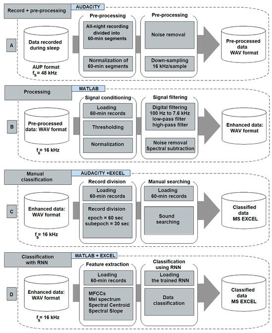 Overview diagram of the proposed method of the audio recordings: (A) record and signal pre-processing; (B) signal processing; (C) manual classification; (D) classification using RNN.