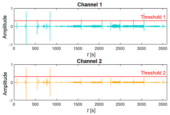 The first step involves loading the hourly recording (both channels) with a sampling frequency of 16 kHz into the InputData structure using the LoadAudioData function. If the recording exceeds 60 min, it is automatically shortened to the required number of samples (57.6 × 106 samples for both channels). Sleep sound signals commonly contain high peaks (e.g., door slamming) that need to be eliminated. The PeaksExtraction function, which has been designed and created, enables the interactive selection of a specific threshold value above which the signals will be clipped, Figure 7. If there are no peaks in the signal, this step can be skipped. Then, the modified signal undergoes filtering using a pair of digital finite impulse response (FIR) filters. The first filter is a low-pass filter with a cut-off frequency of 7.5 kHz, followed by a high-pass filter with a cut-off frequency of 100 Hz. The filter delay was determined using the “grpdelay” function, and the corresponding delay samples were removed from the records. Afterwards, a method called spectral subtraction is applied to suppress noise and improve the signal within the desired frequency band (100 Hz–7.5 kHz). Specifically, a multiband spectral subtraction algorithm, commonly used for enhancing speech signals, was utilized. Finally, the processing is visually inspected for accuracy, and relevant oscillograms and spectrograms are generated, as shown in Figure 8.