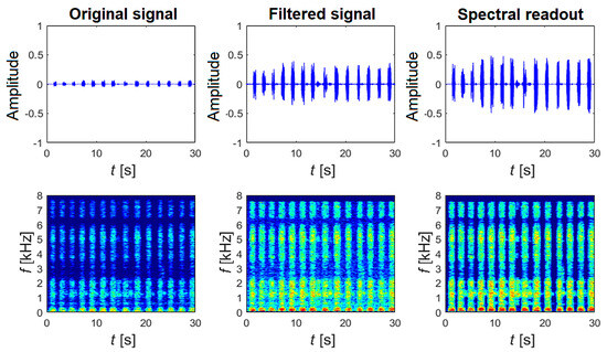 Selected 30 s sub-epoch of the entire overnight recording, showing the signal’s time course and spectrograms for the original signal, the filtered signal, and after applying multi-band spectral subtraction on the 1st channel.