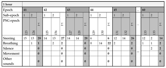 During segmented periods, events are categorized and recorded. For instance, in Figure 9, during sub-epoch 41.1, 15 snoring events (indicated by the red ellipse) were identified. In sub-epoch 41.2, there were 13 snoring events (green ellipses) and one breathing event (purple ellipse). The recorded events in each sub-epoch are totalled and entered into a prepared EXCEL form. This form is divided into the appropriate number of hours, epochs, sub-epochs, and five categories. An example of the form for recording events in individual epochs is presented in Figure 10. The table also combines the category movements with other sounds. It is noteworthy that only episodes lasting over 5 s are considered as silence. Therefore, a brief interval of silence between two snoring sounds is not classified as silence to avoid numerous redundant silence events. The results of the manual classification consist of 5 forms, with manually added events designated for specific categories. Manual classification is crucial for creating a dataset for individual categories and preparing for classification using RNNs.