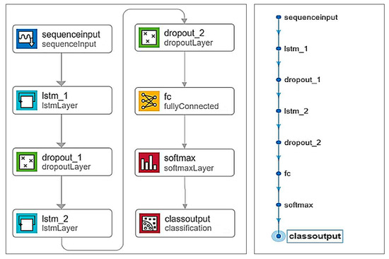 The LSTM network with two layers was chosen for classification, which is deemed sufficient even for tackling more complex problems. The network architecture is depicted schematically in Figure 11.