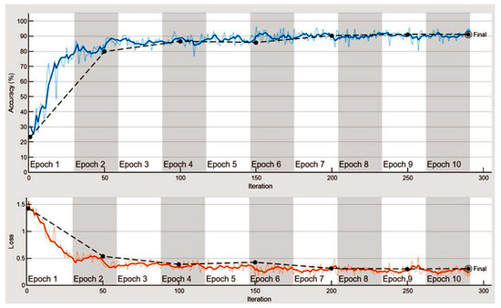 To create a neural network model, the final step is to train the LSTM network and configure its parameters. The training process consisted of 10 epochs, with a mini-batch size of 128 and a learning rate of 1 × 10−3. Training the network took approximately 35 min using an AMD Ryzen 5 3600X CPU (Santa Clara, CA, USA). The training progress can be monitored to check the training and validation accuracy immediately, as shown in Figure 13. With a larger training dataset, the learning process would take several hours, depending on the hardware and parameters used. Throughout the training, the accuracy of the deep neural network reached 91.16%.