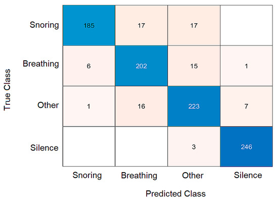 To provide a more detailed assessment of the classifier’s performance, we evaluated additional metrics beyond overall classification accuracy (Table 4). Specifically, we calculated class-wise precision, recall, and F1-score for each of the four categories: snoring, breathing, silence, and other sounds. These metrics were derived from the confusion matrix presented in Figure 14, based on the validation dataset that was not used during training.
