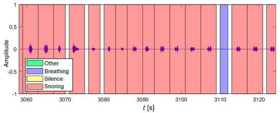 The results can be visualized and analyzed. In this specific example, Figure 15 represents a selected time interval from the first hour of recording No. 3. During this time, snoring sounds (marked in red) and one breathing sound (marked in blue) were correctly classified.