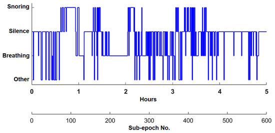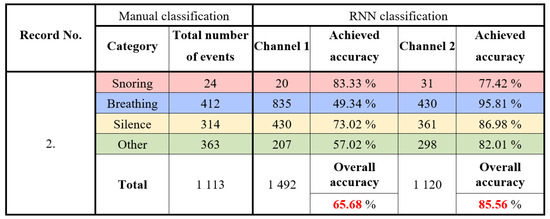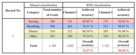 Six all-night sound recordings were made during sleep at the Children’s Sleep Laboratory, UHM. Recordings numbered 1 to 5 were classified and analyzed. Record 6 was used for calibration, verification of the proposed method, and testing the optimization and parameters of the algorithms. All recordings were shortened to 5 h, and the sections at the beginning of the examination (calibration of PSG sensors) were removed. Each recording was manually scored by searching for sounds in the respective epochs, followed by neural network classification. The results obtained using manual scoring were compared with those using the designed classifier to determine the classifier’s accuracy for records 1 to 5. In Figure 16, the detailed classification results for record one are presented. A total of 1165 events were manually classified. The classification using RNN achieved an accuracy of 72.27% for channel 1 and 93.35% for channel 2.
