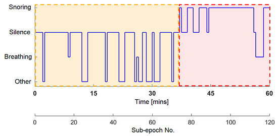 Manual classification: To obtain and interpret information from the processed signal, it is necessary to evaluate sound events related to different sleep patterns manually. The sounds are classified into four categories: 1: snoring, 2: breathing, 3: silence, and 4: other sounds (movements, speech, noise). The manual scoring method proposed in this work involves the following steps. The overnight recording (5 h) undergoes pre-processing and is then loaded into Audacity. The 1st hour is loaded first, followed by the 2nd hour, and so on. Each hour is divided into 60 sections of equal length called 60 s epochs. Each epoch is further divided into two 30 s sub-epochs, which are correlated with the epochs of the video-polysomnographic recording. Figure 9 illustrates the manual evaluation process for each epoch (60 s) or each sub-epoch (30 s) of the recording.
