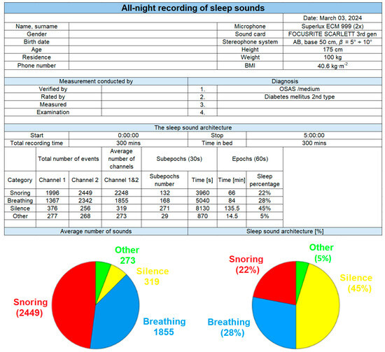 The final output of the classification of the all-night recording is a report that includes basic information about the patient, the technique used, and the sound structure of sleep (Figure 20). This document is divided into segments in the form of tables. The first table displays basic information about the patient (name, surname, physiological parameters), the type of measuring microphone used, and the type of sound card. The subsequent table contains the names of healthcare professionals who may be involved in recording and evaluation. Adjacent to it, there is a box for recording the diagnoses for which the patient is being examined, or which are suspected. The report also contains: the start and end time, total recording duration, and the time the patient spends in bed. As this is a stereo recording, the total number of events recorded for each category (1: snoring, 2: breathing, 3: silence, and 4: other sounds) is documented for both channels and then averaged across channels. The number of sub-epochs indicates the prevailing sound in each 30 s segment. For example, if snoring is dominant in a particular sub-epoch, it is classified as a snoring sub-epoch. The Sleep Sound Architecture table includes a graph representing the percentage of various sub-epochs. For this recording, the breakdown is as follows: duration of the total sleep duration consisted of other sounds (speech, noise, door closing, etc.); time, which was dominated by sounds associated with silence, implying peaceful sleep with hushed breathing (intensity of approximately 20 dB); duration of sleep included sounds typical of breathing; the total recording duration which included snoring sounds. In the final section of the report, the SleepSoundGraph is plotted for the entire recording duration (5 h, 600 epochs), followed by graphs for each hour. From these graphic representations of the dependence of the occurrence of sounds of individual categories as a function of time, it is relatively easy to find out in which hour and in which sub-epoch, which sound dominated (where the given period belongs). In this way, clear information about the sound architecture of sleep is obtained. Based on the information in this report, it is possible to find an area of interest in the audio recording, replay it and analyze it further. If necessary, such a report can be supplemented with additional data (detailed analysis of each recording hour, graphical representations).