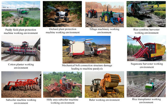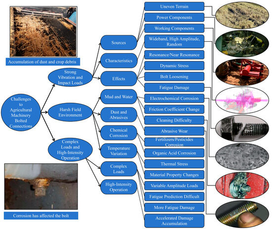 Modern agriculture is undergoing a profound transformation towards enhanced efficiency, precision, and sustainability, and within this transition, agricultural mechanization and intelligence function as indispensable cornerstones [1,2,3,4]. The deployment of advanced agricultural equipment—such as tractors, combine harvesters, and precision planters—not only substantially increases labor productivity and operational efficiency [5,6] but also provides the technological foundation for modern agricultural paradigms like precision and smart farming [7]. Agriculture is a seasonal activity, and agricultural machinery is machinery that is used seasonally, with some machines only being used for a few days during the year. These machines are exposed to the effects of dust, rain, mud, snow, and other influences. Very often these machines are located outdoors and are not protected from weather conditions throughout the year. These are just some of the reasons that indicate the problem of difficult maintenance of all working elements, especially screw elements [8,9,10,11]. These uniquely harsh working conditions impose stringent demands on structural integrity, functional stability, and long-term reliability [12]. Critically, unplanned downtime resulting from mechanical or structural failures during peak agricultural seasons can precipitate substantial economic losses and crop yield reductions [13,14]. Therefore, ensuring and enhancing the reliability of agricultural machinery represent a central theme in modern agricultural engineering, vital for propelling the agricultural modernization process [15]. Within the large-scale and intricate structural framework of agricultural machinery (Figure 1), bolted connections represent the most prevalent and fundamental means for component fixation and assembly, owing to inherent advantages such as standardization, ease of assembly/disassembly, and cost-effectiveness [16,17]. Their application is widespread, spanning the attachment of power systems (engines, transmissions) to frames, the assembly of load-bearing structures like chassis, suspension systems, and running gear, and the securing of various direct soil-engaging or crop-processing components (e.g., plowshares, rotary blades, harvester header elements) [18,19]. A single large agricultural machine often incorporates thousands of such connection points, which function critically to integrate individual parts into a cohesive, operational whole, responsible for load transmission, maintenance of geometric precision, and ensuring structural rigidity and strength [20,21]. Consequently, the tightening status and overall health of these numerous bolted joints directly govern the machine’s operational performance, work quality, service life, and, ultimately, operational safety [22].