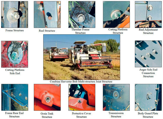 The reliability of bolted connections fundamentally underpins the overall dependability of agricultural machinery. Taking the combine harvester as an example, a complex agricultural machine utilizing numerous bolted structures as illustrated in Figure 2, continuous operating vibrations caused primarily by the complex operating conditions of agricultural machinery, primarily movement on uneven terrain, act as a primary external driver, causing micro-movement and rotational tendencies in the bolts, culminating in self-loosening. Despite their indispensability, bolt loosening persists as a chronic and difficult-to-remedy issue during the practical operation of such machinery [23]. Continuous operational vibration acts as the primary external driver, inducing micro-motion and rotational tendencies in bolts, which culminates in self-loosening [24,25]. Concurrently, factors including material creep, stress relaxation, settlement at the connection interfaces, and environmental corrosion contribute synergistically to the gradual decay and loss of bolt preload [26,27]. The consequences of bolt loosening or inadequate preload are significant, i.e., the initiation of abnormal component vibration and noise [28], reduction in connection strength and stiffness, acceleration of fatigue damage accumulation [29], and potentially progressing to complete joint failure and component detachment, thereby precipitating severe mechanical failures or safety incidents [30].
