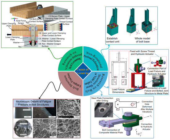 Vibration-induced self-loosening: This represents the most prevalent and extensively studied loosening mode [41]. Under the influence of transverse vibration (perpendicular to the bolt axis), minute relative slip occurs at the contact interfaces of the thread pair and between the nut/bolt head and the clamped components [42,43]. When the vibration amplitude is sufficiently large, this micro-slip overcomes the frictional forces, leading to gradual reverse rotation of the nut (or bolt), thereby causing a rapid decrease in bolt preload [44,45]. While axial vibration typically does not directly induce rotation, it causes periodic fluctuations in preload, which can also exacerbate the loosening process [46]. Many components on agricultural machinery, such as engine mounts, transmission connections, and suspension systems, are persistently exposed to this high-risk vibratory environment [47].