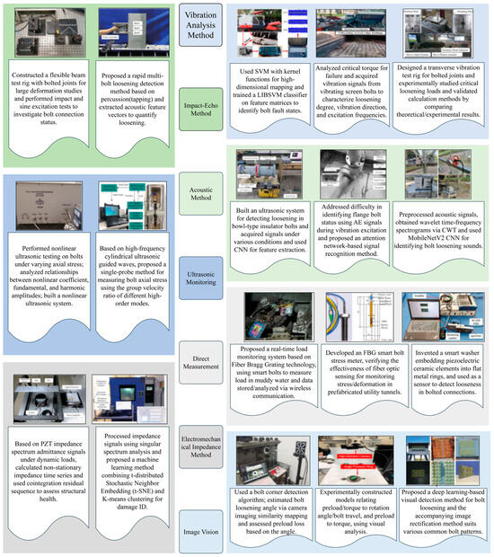 To facilitate more effective monitoring and management of agricultural machinery, diverse detection technologies have been developed by researchers. These methodologies function based on distinct physical principles, each exhibiting unique characteristics and specific domains of applicability. This section systematically delineates the principles and features of conventional detection methods, alongside the fundamental operational principles of several predominant modern online monitoring approaches enabled by advanced sensing technologies [105,106,107,108]. Numerous representative studies on bolt monitoring have been conducted [109,110,111,112,113,114,115,116,117,118,119,120,121,122,123,124,125,126], as illustrated in Figure 6.