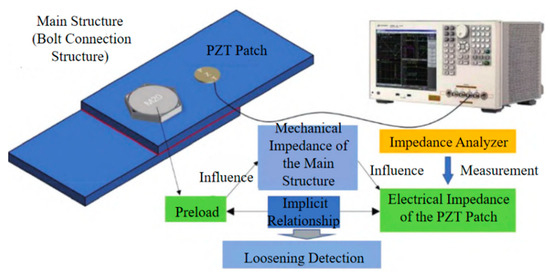 Electromechanical Impedance (EMI) Method (Figure 13): This technique leverages the piezoelectric and inverse piezoelectric effects of piezoelectric materials, typically PZT (Lead Zirconate Titanate) patches, for structural health monitoring [170]. A PZT patch is bonded to the monitored structure, often on or near the bolt head or nut surface. By applying a swept-frequency sinusoidal voltage excitation to the PZT patch and simultaneously measuring the resultant electrical current, the patch’s electrical admittance (or impedance) spectrum is obtained. This electrical signature is intrinsically coupled with the mechanical impedance of the host structure to which the PZT is attached [171]. Consequently, any changes in the structure’s physical properties—such as alterations in local stiffness or damping caused by bolt loosening—modify the structure’s mechanical impedance. This modification, in turn, induces measurable changes in the PZT’s electrical admittance/impedance spectrum [172,173]. Comparative analysis between the impedance signature obtained under the current condition and a baseline signature representing the healthy (tightened) state, often quantified using damage indices like Root Mean Square Deviation (RMSD), enables the detection of bolt loosening [174]. Notably, environmental factors, particularly temperature variations, exert a significant influence on the measurement outcomes [175].