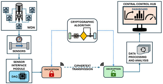 In a utility management context, the implementation of cryptographic algorithms is essential for securing wireless sensor data communication. The process of applying a cryptographic algorithm to a water distribution network is illustrated in Figure 1. Data collected from various sensors, such as flow, level, and pressure sensors, is first gathered by a sensor interface module, which functions as a data acquisition unit. This module is equipped with data conditioning capabilities, which are used to encrypt the data before transmission. The original plaintext data is transformed into a ciphertext through a cryptographic conversion and then transmitted. Upon reception, the ciphertext is converted back into the original data through a decryption process, which uses the same cryptographic algorithm. The decrypted data is subsequently analysed and transferred to a central control hub responsible for data storage, further analysis, and visualisation.