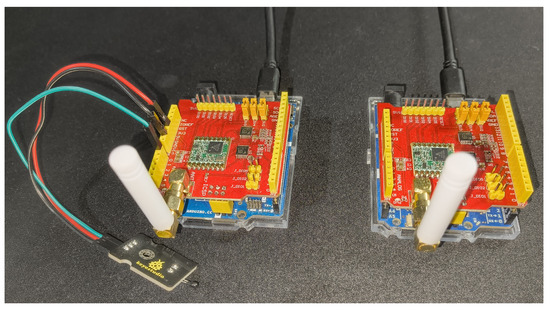 The experimental validation and testing of the ChaosFortress cryptographic algorithm were done on the Arduino Platform [39]. The algorithm was ported into an Arduino library format, which can be used to program Arduino boards. Here, we chose the Arduino R4 boards(Arduino SRL, Turin, Italy), namely the Minima and the Wi-Fi. Arduino is also ideal from the comparative study perspective since the algorithms we compare with ChaosFortress are readily available as Arduino libraries [40]. Figure 2 shows the setup consisting of two modules. The first, a transmitter module, features an Arduino R4 Minima paired with a LoRa Hat, which receives data from a thermistor-based temperature sensor. The second module, the receiver, is based on an Arduino R4 Wi-Fi with a LoRa Hat. LoRa [41] was chosen for the comparative testing of our algorithm to make the validation more realistic with the real-world implementation of IoT systems. LoRa is one of the most popular wireless standards in IoT networks due to its low power consumption and long range, especially in metering of utilities like water, gas and electricity [42]. Among the available LoRa standards, we chose the 915–928 MHz frequency band following the AS923 standard [43]. A temperature sensor was added to the transmitter setup as the data source for all the testing. The sensor was a simple thermistor-based analog temperature sensor, which could be interfaced to the analog input pins of the Arduino and read using the built-in Analog to Digital Converter (ADC) [44]. The sensor is mounted to sense the ambient temperature or the temperature of any surface in contact with it. ADC converts the sensor’s analog signal to a digital form, making it compatible with the microcontroller. Arduino UNO R4 supports the 10-bit, 12-bit and 14-bit ADC resolutions. We use the standard 10-bit resolution, which converts the analog voltage output of the sensor into a digital value between 0 and 1023. This value is later converted into a temperature value in degrees Celsius using standard conversions for the thermistor-based sensor [45].