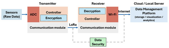 The data security in a sensor network consists of two primary domains: local telemetry and internet communication. Local telemetry involves the point-to-point data transmission between transmitter and receiver modules. This stage utilises various wireless technologies to transfer sensor data before it is relayed to a central data management platform. For the purposes of this study, a LoRa wireless transmission system is employed for all local telemetry, and all subsequent testing and evaluations are based upon this specific implementation. Figure 4 shows the sensor network architecture and the need for data security in the data transmission. We are concerned with data security in local telemetry since we focus on lightweight encryption for resource-constrained devices in IoT systems.