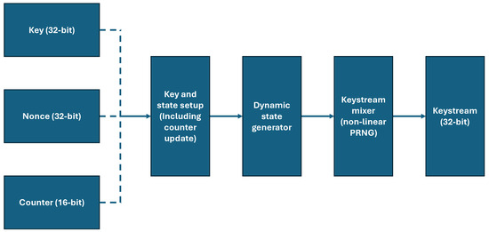 The keystream generation stage derives a unique keystream for each message or plaintext value using the key schedule and mixing of the user-defined components, as shown in Figure 5. The keystream generation process commences with a key and state setup stage, where the initial key, nonce, and counter are transformed through a series of Add-Rotate-XOR (ARX) operations. This initial mixing introduces statefulness and time-variant properties to the cryptographic process. Subsequently, a second round of similar operations evolves this internal state. This stage, however, operates on the intermediate state variables rather than the initial parameters, a method designed to inject non-linearity and entropy in a manner analogous to a chaotic random number generator. The multiple layers of bitwise operations contribute to the system’s overall cryptographic complexity. The resulting keystream is both message-unique and session-unique due to the respective functions of the counter and the nonce. The architecture emulates the principles of a stream cipher while remaining lightweight, ensuring its suitability for resource-constrained devices where performance and memory footprint are critical design parameters.