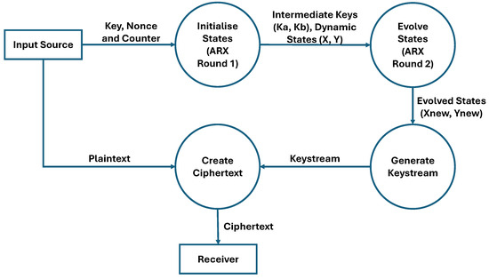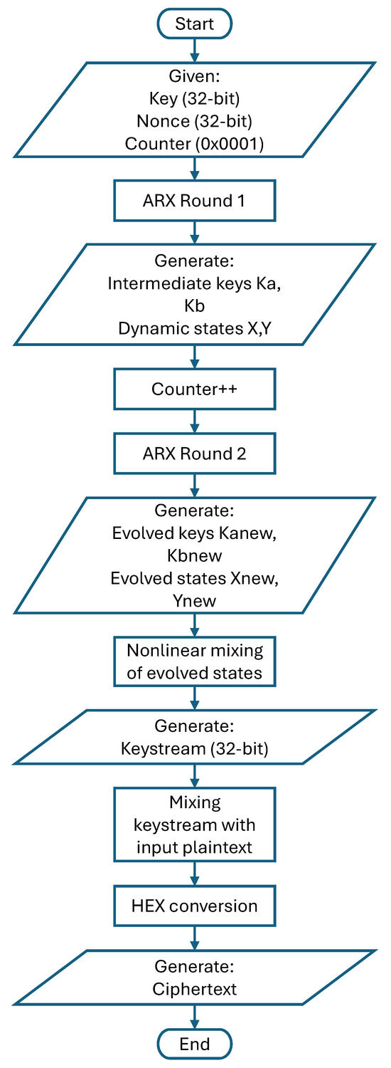 During the encryption stage, the plaintext is transformed into ciphertext using the generated keystream, as depicted in the data flow diagram in Figure 6. The process is initialised with a user-defined 32-bit key, 32-bit nonce, and 16-bit counter. These inputs undergo the first round of Add-Rotate-XOR (ARX) operations to produce intermediate keys (Ka, Kb) and dynamic state variables (X, Y). Following this round, the counter is incremented. A second round of ARX operations then evolves the intermediate keys into new keys (Kanew, Kbnew) and further develops the dynamic state through additional mixing. This non-linear mixing of the evolved state variables efficiently scrambles the data to generate the final 32-bit keystream. This keystream is then combined with the plaintext, and the result is converted to a hexadecimal format to form the final ciphertext, which is then ready for transmission. The complete operational flowchart is illustrated in Figure 7.