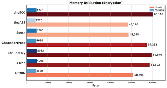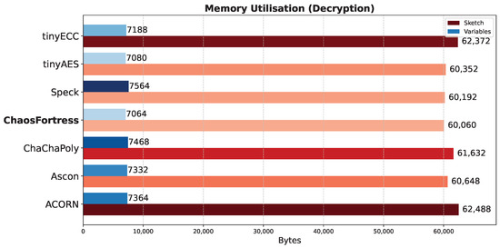 This test evaluated the memory consumption of each algorithm during identical encryption tasks. The experiment utilised an Arduino transmitter–receiver pair to transmit ciphertext generated by encrypting temperature values obtained from a temperature sensor. The analysis focused on the memory utilised for encryption in the transmitter and decryption in the receiver. The total memory consumed during encryption (Figure 8) or decryption (Figure 9) comprises the memory allocated to the Arduino code and the memory occupied by the global variables defined within the code. Generally, larger cryptographic libraries result in higher memory usage in the sketch. The memory used by the global variables remains relatively consistent across all algorithms, with only minor variations observed due to different keys, nonces, and other blocks involved in the encryption process. For encryption, ChaosFortress used 4624 bytes of memory for storing the variables and 57,252 bytes of memory for storing the code. These numbers were comparable to the tinyAES, which used the least memory for both variables and code at 4276 bytes and 48,176 bytes, respectively.