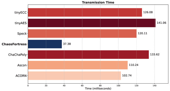 The transmission time refers to the duration required by a transmitter–receiver pair to complete one payload transmission successfully. This measurement encompasses the time the payload travels from the transmitter to the receiver. The transmission time was determined experimentally by using the transmitter–receiver pair to send multiple transmissions of inputs formatted as float temperature values from the thermistor. Time stamps, recorded with millisecond resolution on both the transmitter and receiver modules, were used to calculate the transmission time, as shown in Figure 10. ChaosFortress outperformed the other algorithms in the transmission tests with a good margin. When ChaosFortress took 37.38 ms on average to complete a successful transmission from the transmitter to the receiver using LoRa, the runner-up, ACORN, took 102.74 ms, which is three times slower than ChaosFortress.