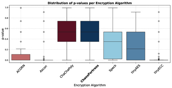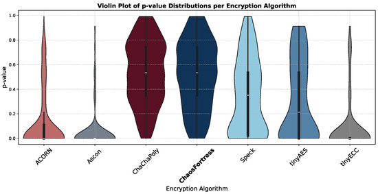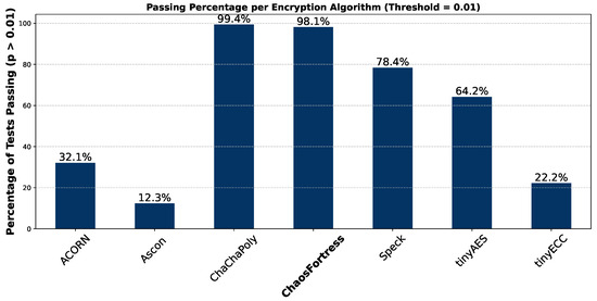 In the security analysis conducted using the National Institute of Standards and Technology Statistical Test Suite (NIST STS), significant variations in the security performance of the algorithms were revealed. The boxplot in Figure 11 illustrates that ChaChaPoly and ChaosFortress demonstrated superior performance, yielding p-values that were uniformly distributed across the testing suite. This uniformity is a key indicator of high-quality cryptographic randomness. Conversely, tinyECC and Ascon yielded the least favourable results. This finding is further validated by the violin plot in Figure 12, which depicts the data’s density distribution. The distributions for ChaChaPoly and ChaosFortress are visibly even and wide, in stark contrast to the localised and non-uniform distributions observed for the other algorithms. This suggests that the latter group of algorithms exhibit weaker randomisation properties. The pass or fail threshold for each test within the NIST STS suite is a value between 0 and 1. As illustrated in Figure 14, which presents the pass rate, ChaChaPoly and ChaosFortress significantly outperformed the other algorithms, achieving scores of 99.4% and 98.1%, respectively. In contrast, Ascon demonstrated the weakest performance, followed by tinyECC. Table 4 shows the overall performance comparison of ChaosFortress with the existing algorithms in the various key aspects.
