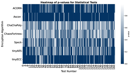 Overall heatmap of p-values for the tested algorithms across 162 tests in NIST STS.