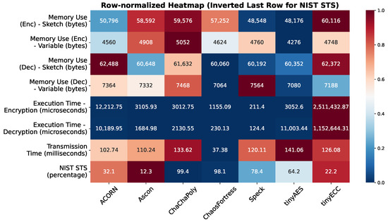 A heatmap of the p-values from all 162 statistical tests affirms the dominance of ChaChaPoly and ChaosFortress. The performance map in Figure 15 provides a holistic comparison of all algorithms, considering various performance metrics. This analysis highlights the specific advantages of ChaosFortress for implementations of lightweight cryptography, particularly in resource-constrained applications where efficiency is paramount.