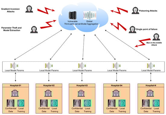Collaborative machine learning presents critical advancements for healthcare institutions. Individual hospitals and medical centers typically maintain limited datasets, which constrains the performance of the model. Decentralized learning approaches that aggregate data from multiple sources enable comprehensive pattern recognition and improved classification accuracy. Such collaboration requires methodologies that preserve data privacy while facilitating effective model training. This capability is achieved by secure collaborative learning using federated learning, where model parameters rather than raw data are shared among participants. However, recent surveys have revealed that gradient updates exchanged during federated learning are vulnerable to reverse engineering attacks [4,5,6]. Among these, gradient leakage attacks and model inversion attacks, as illustrated in Figure 2, allow malicious parties to reconstruct sensitive training data from shared model parameters, compromising the privacy guarantees of federated learning.