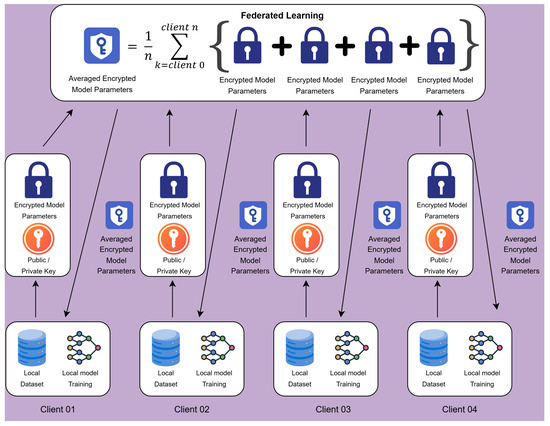 The Privacy-Preserving Federated Learning Model Parameter framework (PPFLMP) described in Algorithm 1 integrates homomorphic encryption with federated learning as illustrated in Figure 3, ensuring secure model aggregation. The key operations include: