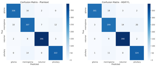 We systematically evaluated datasets [27,28] using MobileNetV2, MobileNetV3, ResNet34, ResNet50, and DenseNet121 models in a federated learning environment with CKKS homomorphic encryption scheme. This encryption process introduces noise into the numerical computations, which can affect model convergence patterns and final accuracy. However, our results demonstrate high classification accuracy while providing robust privacy guarantees. According to Table 5, within the encrypted adaptive federated learning setup, MobileNetV2 achieved 93.24% accuracy for pneumonia detection, while DenseNet121 reached 94.19% for brain tumor detection. Compared to plaintext federated learning baselines, the accuracy degradation introduced by the HEAT-FL framework remains within 0.5–1.5% across all model architectures, representing an excellent privacy-accuracy balance for sensitive healthcare applications. Figure 4 presents the confusion matrix for the DenseNet121 model applied to brain tumor MRI classification under both plaintext and HEAT-FL encrypted scenarios. Furthermore, a detailed evaluation using class-wise precision, recall, and F1-scores is provided in Table 6, highlighting the performance of the proposed HEAT-FL framework.