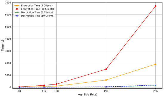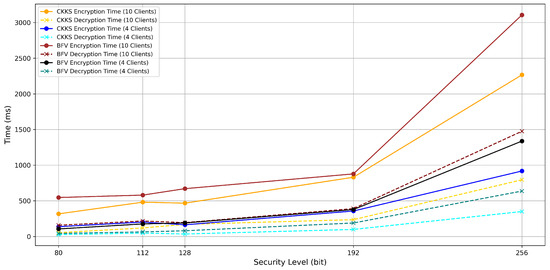 The computational overhead caused by homomorphic encryption (HE) in PPFLMP refers to the additional processing time required for encrypting, decrypting, and handling encrypted model parameters. To implement PPFLMP using TenSEAL version 0.3.16, the parameters were configured to match with standard security levels of 80, 112, 128, 192, and 256 bits. A custom lightweight model was used on the MRI Brain Tumor Dataset for the experiments due to time and computational resource constraints. As shown in Figure 5, encryption and decryption times increase with higher polynomial modulus sizes. This is expected, as greater security levels require larger key sizes, which result in more complex arithmetic operations on encrypted tensors. Since model parameters in federated learning are represented as tensors, the computational cost is dominated by both the dimensions of these tensors and the underlying HE scheme. Although encryption time increases with security level, the execution times remain within a feasible range measured in millisecond, making TenSEAL a practical choice for secure federated learning. For comparison, the Paillier encryption scheme was also tested at equivalent security levels using respective key sizes [12]. As illustrated in Figure 6, both encryption and decryption times increase substantially with key size, especially for higher security levels. Paillier exhibits a steeper rise in computational time compared to the CKKS and BFV schemes. This difference comes from the fundamental architectural design between the two schemes. TenSEAL, which is based on Learning With Errors (LWE), supports approximate computations over tensors and offers full homomorphic capabilities [25]. CKKS is capable of directly encoding floating-point tensors into ciphertext, while BFV requires integer conversions, which consume more computational costs. In contrast, Paillier is only partially homomorphic and lacks built-in support for tensor operations, requiring additional processing to adapt model parameters into compatible formats [32].