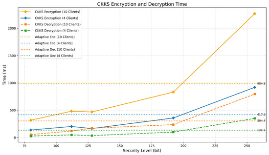 Building on the previous results, we evaluated the proposed adaptive CKKS versus plain CKKS encryption overhead. The adaptive approach assigns higher encryption priorities to final classification layers and initial feature extraction layers, as these layers are the most sensitive. Middle layers and activation function layers receive lower encryption priorities since they are considered less critical parameters. The comparison is shown in Figure 7. With this approach, we used the highest level of security for more critical layers of the model by reducing the overall computational burden. Compared to the fixed 256-bit security setting (polynomial modulus degree 32768), it achieves a 56.5% reduction in encryption time for 10 clients and 54.6% for 4 clients per one federated round.