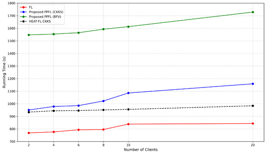 Figure 8 compares the total execution time of standard federated learning (FL) and PPFLMP using CKKS, BFV, and HEAT-FL CKKS, with respect to the number of participating clients under 256 bit-level security settings using the TenSEAL library. As shown, the PPFLMP-BFV framework consumes higher runtime than the framework based on CKKS, which is due to the additional operations performed based on integer transformation. However, the overhead generated by CKKS encryption schemes remains within acceptable limits and exhibits a linear growth pattern.