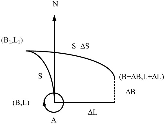 where B and L, respectively, are the geodesic latitude and geodesic longitude; a is the rotation of the ellipsoid’s long half-axis length; is the first eccentricity of the square; A is the the azimuth of the geodesic line from the moving point to the fixed point ; and the change in the relationship is as shown in Figure 2.